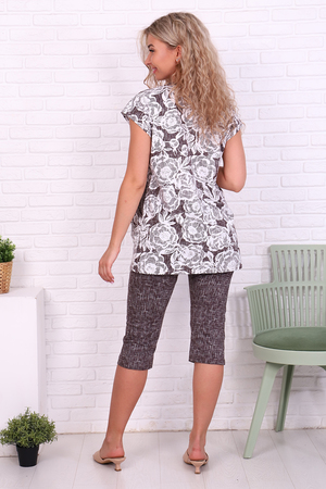 Красивый женский костюм - бриджи свободные из ткани оригинальной расцветки, кофточка из ткани в цветок, отделка в тон бриджей. На полочке карман вшивной, со складками. Рукав короткий, горловина обработана отделочным руликом. Костюм подойдет как для дома, так и для дачи.