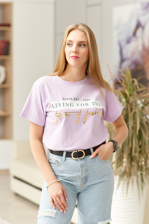 Футболка женская прямого силуэта, длиной до середины бедра. Вырез головины округлый. Рукав втачной, короткий. Полочку футболки украшает буквенный принт.