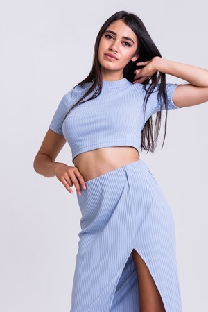 Летний женский костюм с юбкой, с завышенной талией, с разрезом и классическим топом придаст элегантность Вашему образу. Удлиненная юбка с разрезом выглядит как более классический вариант или для более сексуального и запоминающегося образа, дополняет данный костюм классический топ с закрытым декольте на груди, что придаст вашему образу скромность. Разрез на юбке не сковывает движения при ходьбе и придаёт образу особое женское очарование. Утонченный женственный костюм подчеркнёт вашу фигуру. Женский костюм отлично подойдёт для вечернего образа, фотосессии, пляжной моды, идеальный вариант для занятия танцами.