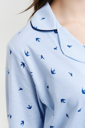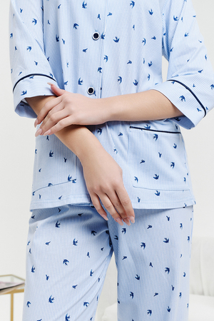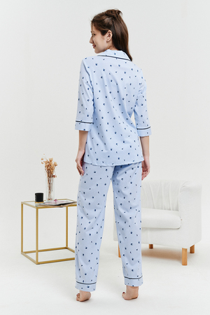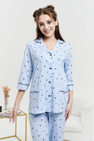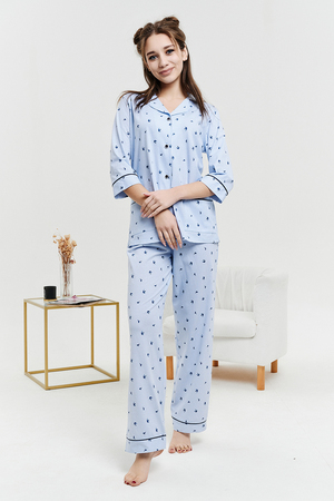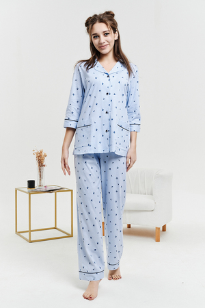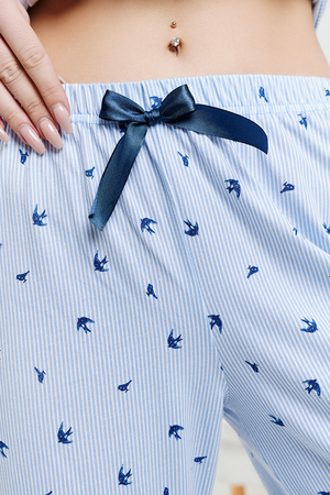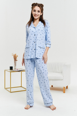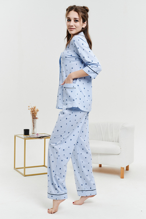 Пижамный костюм из 100% хлопка, состоит из рубашки и брюк. Рубашка на пуговицах с декоративной отделкой. Брюки прямые, верх на поясе с резинкой, декоративный бантик на поясе. Трикотажное полотно, из которого выполнена пижама, не стеснит ваших движений и позволит вашей коже дышать. Данная модель отлично подойдет не только для сна, но и в качестве стильного домашнего костюма.