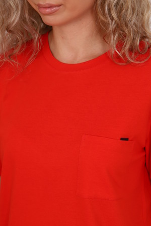 Футболка женская свободного покроя со спущенным рукавом и карманом. Данная модель выполнена из трикотажного полотна кулирка (хлопок 100%). Горловина обработанная обтачкой из основной ткани, на левой стороне на полочке присутствует карман накладной с декором. Отличная модель для повседневной носки и дома.