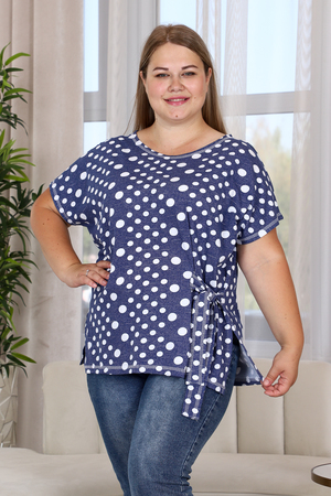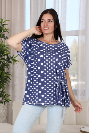 Туника женская, прямого силуэта. Рукав короткий цельнокроенный. Низ изделия регулируется двумя завязками, по боковым швам разрезы