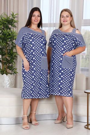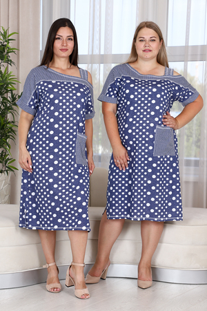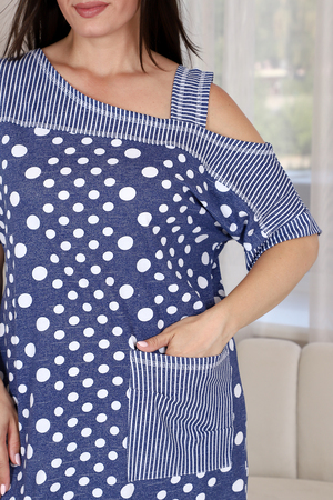 Платье женское, полуприлегающего силуэта. Рукав короткий цельнокроеный на манжете с одной стороны, с другой стороны открытое плечо на широкой бретели. На полочке один накладной карман, в боковых швах разрезы. Сочетание ткани "в полоску" и горох, придают платью особую выразительность.
