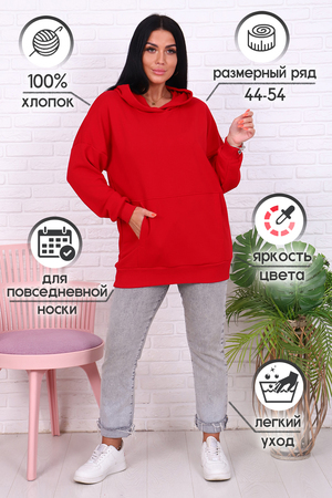 Красная женская толстовка. Данная модель выполнена из трикотажного полотна футер 3-х нитка петля диагональ (100% хлопок). Очень приятная мягкая ткань. Модель свободного силуэта с карманом кенгуру и капюшоном. Линия плеча спущена. Манжеты и низ толстовки обработаны плотной резинкой кашкорсе. Подходит для отдыха и прогулок. Стильная, очень модная толстовка будет вас радовать каждый день. В измерениях длина рукава указана от шва втачивания рукава.