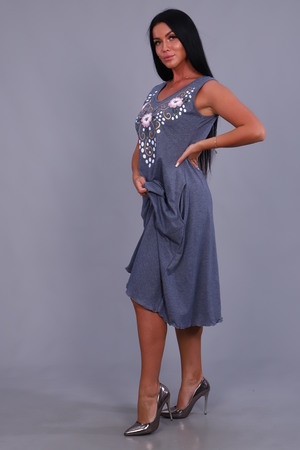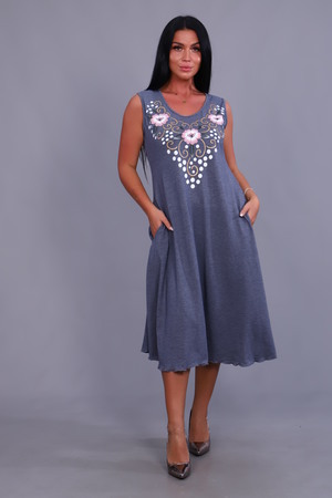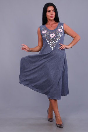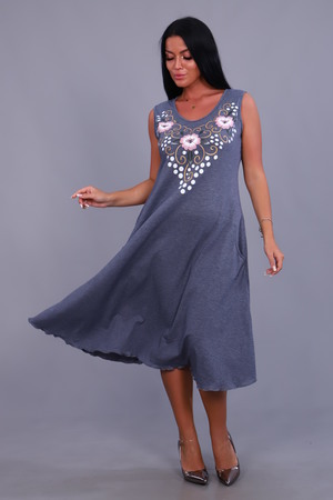 Сарафан женский расклешенного силуэта с печатью на передней полочке. По низу изделия края обработаны краевкой. Пройма и горловина окантовка. Карманы по бокам. Легкое, свободное, подходит для беременных, отлично скрывает недостатки.