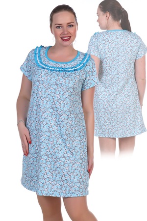 Сорочка из кулирки. Короткие рукава, дизайн в виде цветочного узора, цветная окантовка горловины, общая длина сорочки приблизительно до середины бедра. Размеры от 48 до 62.