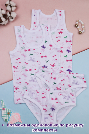 В комплект входит 2 майки и 2 трусов с мягкой, эластичной резинкой. Белье не раздражает детскую кожу, благодаря нежному материалу и мягким швам. Милый дизайн будет дарить хорошее настроение своей обладательнице. В нашем ассортименте представлены разные рисунки, они могут отличаться от представленных на сайте.