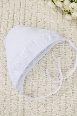 Чепчик из трикотажной ткани кулирки 100% хлопок обработан кружевом. Подходит как для крещения, так и для повседневной жизни.