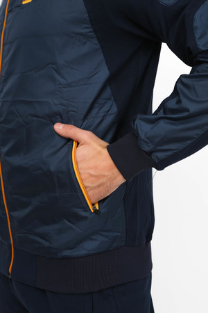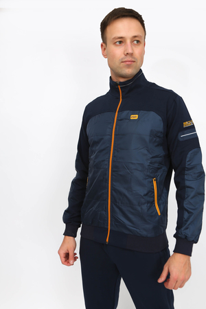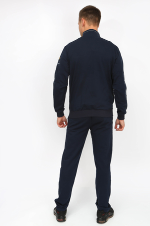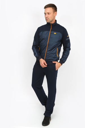Спортивный мужской костюм. Кофта на молнии, спереди и на рукавах декоративная вставка из плащевки, сбоку вышивная надпись. Воротник - стойка, низ кофты и рукава на манжетах. Брюки прямого кроя, карманы на молнии. Костюм отличного качества из турецкой ткани. Подойдет для прогулок, спорта, отдыха.