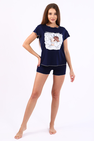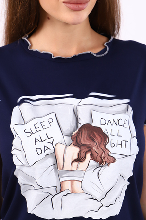 Женский костюм-пижама из эластичной ткани - вискозы, состоящий из футболки и шорт. Футболка свободного силуэта с ярким принтом - "девушка в подушках" и надписи "Sleep all day. Dance all night" и коротким втачным рукавом-крылышком. Горловина, низ рукава и низ футболки обработаны декоративным оверлоком с контрастной нитью в тон принта. Изделие выполнено из вискозного полотна мягкого и нежного на ощупь, оно приятно к телу, гигроскопично, не скатывается и не линяет. Удобный домашний костюм для отдыха и сна, для дачи, на море, прекрасный подарок любимым девушкам на любой повод!