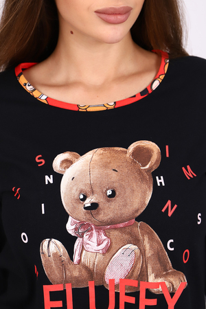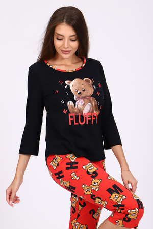 Женский молодежный костюм-пижама, состоящий из футболки с удлиненным втачным рукавом, округлой горловиной, отделанной обтачкой из ткани бридж и закругленным низом и бридж на резинке на талии шириной в 3 см. На груди печать в виде маленького медвежонка и надписи, на бриджах - принт по ткани также в виде медвежат. Пижама сшита из трикотажного полотна, 100% хлопок (кулирка). Удобная, мягкая, приятная к телу, не стесняет движения. Яркие, стойкие цвета ткани соответствуют модным тенденциям. Пижама - незаменимый предмет гардероба каждой женщины. Прекрасно подходит для сна и отдыха, а также для ношения, как домашний костюм, для пижамных вечеринок. Отличный подарок для девочек, юных девушек и женщин.