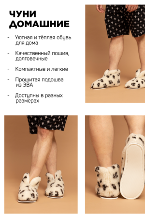 Чуни – идеальная обувь для холодного времени года. Чуни, изготовленные из трикотажного меха с добавлением шерсти, помогут ногам отдохнуть после напряженного трудового дня, согреют после долгой зимней прогулки. Широкий размерный ряд и универсальная расцветка позволяют приобрести такие тапочки для всех членов семьи.