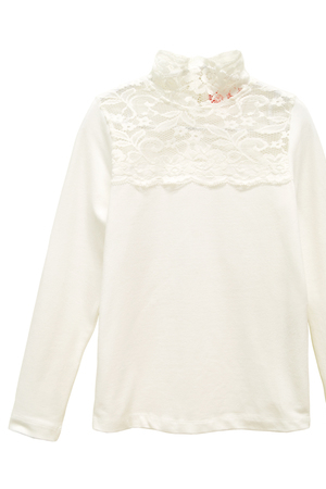 Романтичная блуза полуприлегающего силуэта. Кокетка и воротник-стойка выполнены из гипюра в цвет изделия. Застёжка на спинке в виде пуговицы на ножке.