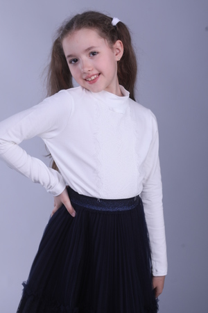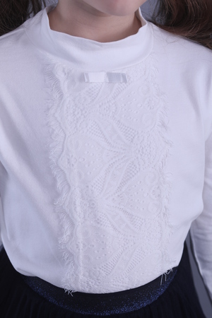Джемпер с воротником-стойкой декорирован кружевом в цвет изделия по центру полочки. Атласный бант в цвет изделия добавляет элегантности. Низ изделия и рукава обработан швом вподгибку.