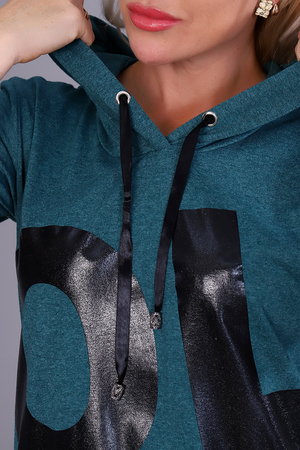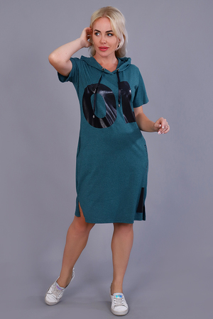 Женская туника из легкого трикотажного материала тонкого хлопка - кулирки. Свободная, спортивная, с капюшоном - её вполне можно использовать как летний вечерний костюм, как повседневный домашний наряд или как легкое праздничное или офисное платье. Благодаря свободному крою, туника отлично подойдет полным и пышным женщинам, беременным девушкам и кормящим мамам. Модный, нарядный черный принт в виде крупных и мелких латинских букв актуален всегда и придает изделию особый шик. Карманы спрятаны в боковых швах для вашего удобства.
