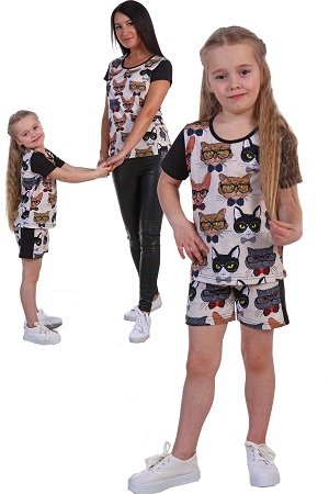 Костюм из кулирки для девочек футболка + шорты. Черная окантовка, черные рукава, принт в виде разных котиков. Шорты длиной приблизительно до середины бедра с аналогичным дизайном. Может быть парой женской футболке 1856 (продается отдельно). Размеры от 28 до 36.