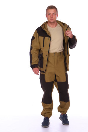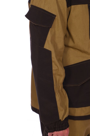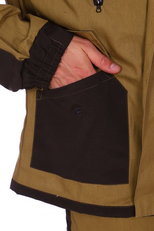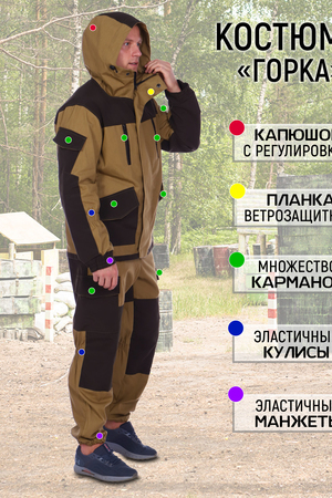 Костюм горка от бренда "СКЕЛА" - выбор настоящих мужчин! Летняя горка костюм мужской состоит из куртки и брюк. Куртка свободного кроя, застёгивается на молнию, которая скрыта планкой на кнопках. Рукава штормовки длинные, с широкими манжетами на резинке. Высокая горловина и капюшон отлично защитят от ветра. Мужской костюм горка имеет два типа карманов: нагрудные прорезные на молнии и накладные на кнопках. Также имеются карманы на рукавах, застегивающиеся клапанами на кнопке. Брюки форма горка свободного покроя с застежкой-молнией и поясом на кнопках. В пояс, на голенище и в области щиколотки вшиты резинки, которые не позволяют задувать холодному ветру. Усилительные накладки костюма предотвращают истирание в проблемных местах. В наличии цвет хаки, накладки темно-коричневые, что делает изделие отличной камуфляжной одеждой. Костюмная ткань палатка плотностью 240 гр/м2, из которой изготовлена тактическая одежда, на 100% состоит из натурального хлопка. Усилительные накладки из смесовой ткани плотностью 215 гр/м2 с содержанием полиэстера 65% значительно увеличивают срок службы костюма. Костюм горка летний отлично подойдёт как одежда для похода в горы, а также для охоты, рыбалки, туризма и в качестве рабочей одежды. Размерная сетка модели включает в себя большие размеры.