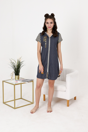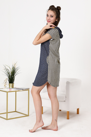 Халат на молнии, полуприлегающего силуэта, длиной выше колена, с капюшоном, с фигурной линией низа, на молнии. Рукав втачной, короткий, из отделочного полотна. На полочке расположены боковые карманы. Спинка с кокеткой, выполнена из отделочного полотна. Вход в карман, борта и капюшон обработаны бейкой из отделочного полотна.