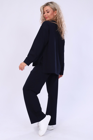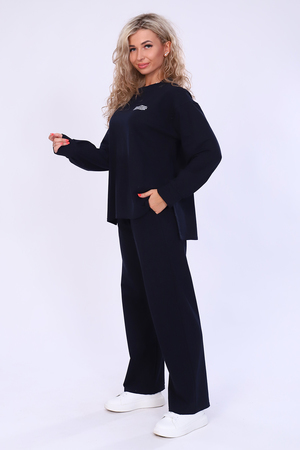 Модный женский костюмчик из плотной ткани. Брюки свободные с карманом, широкие внизу. Кофта свободная по боковым швам разрез. Спинка длиннее, что делает модель модной и стильной. Рукав длинный со складочками на манжете. На груди принт не броский, но придающий вид.