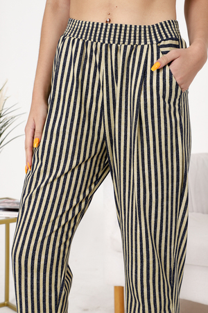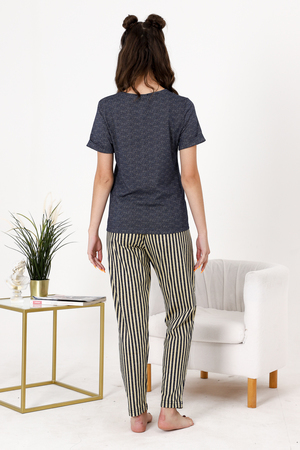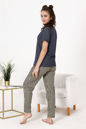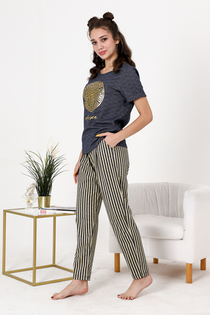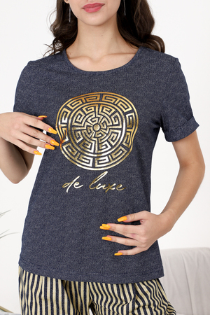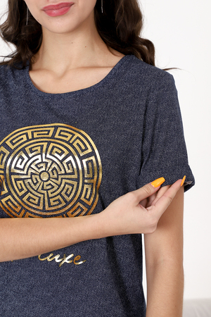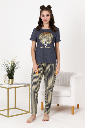 Костюм состоит из футболки и брюк. Футболка прямого силуэта, с округлой горловиной, длиной до середины бедра. Рукав втачной, короткий, с отворотом. Горловина обработана бейкой из основного полотна. Брюки свободные, на поясе, с боковыми карманами. В верхней части передних половинок, по шву притачивания пояса, расположены складки.