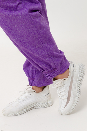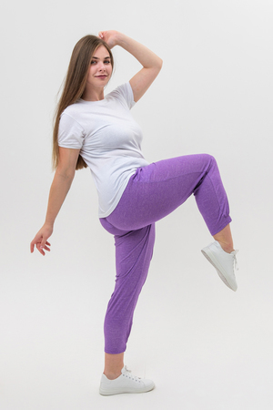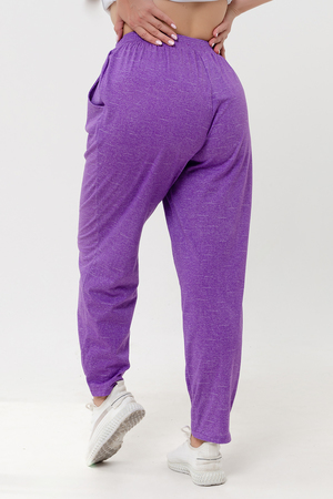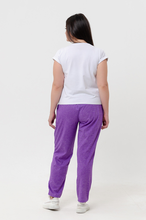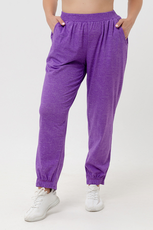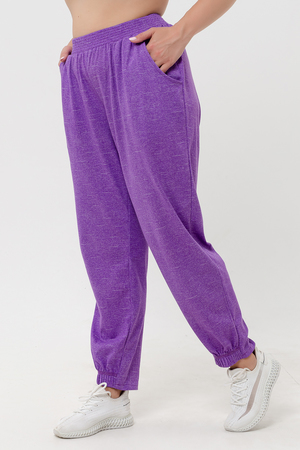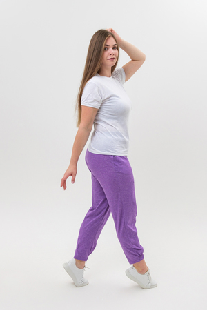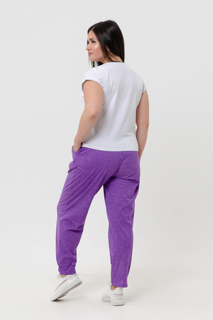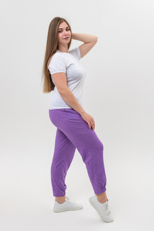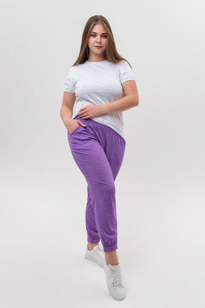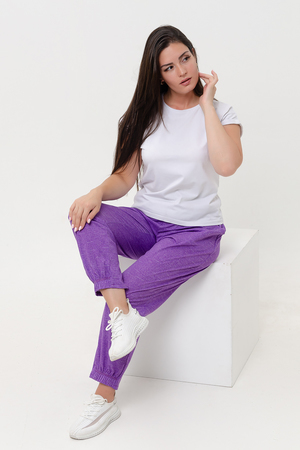 Брюки женские, свободные по бедрам, низ передней части брюк на резинке. Пояс выполнен на многоигольной машине. На передней части брюк внутренние карманы.