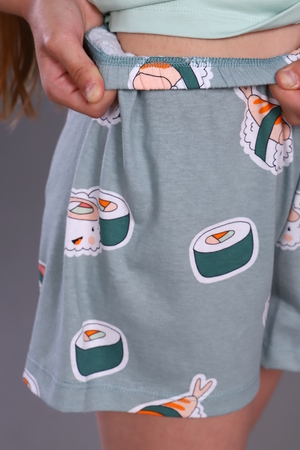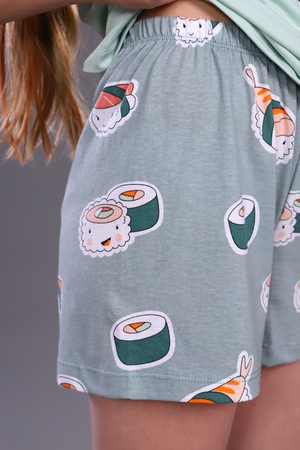 Комфортная пижама для девочки с ярким модным принтом "Суши-роллы". Пижама детская состоит из футболки и шорт. Дизайн ткани позволяет использовать пижаму не только для сна, но и как костюм для дома. Материал очень мягкий и в тоже время износостойкий, не скатывается и не вытягивается. Модель пижамы не сковывает движения ребенка во время сна. Покрой футболки полуприталенная, шорты классические без карманов. Пижама выполнена из 100% гиппоаллергенного хлопка, что позволяет коже ребенка дышать во время сна.