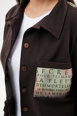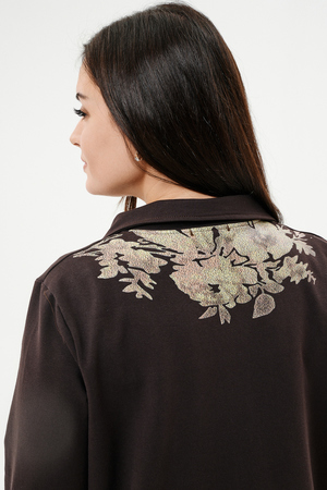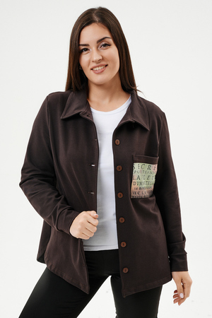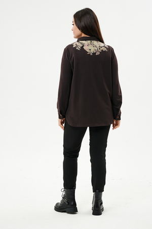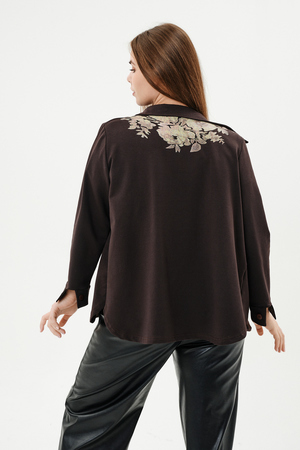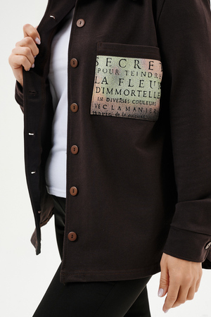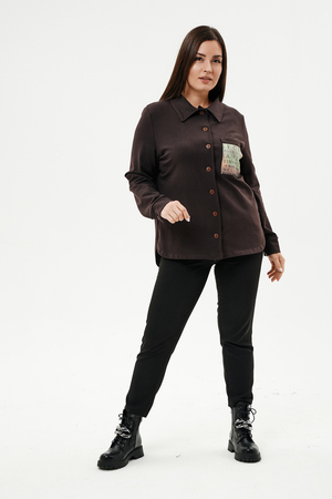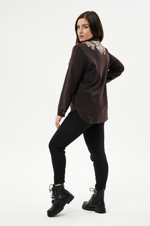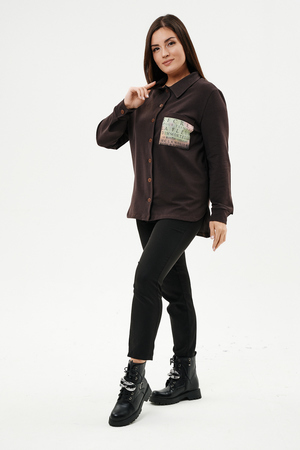 Туника женская прямого силуэта. Воротник отложной. Застежка на петли-пуговицы. Низ фигурный. Рукав втачной с манжетою. На левой части полочки нагрудный карман. Стилизованный принт в верхней части спинки, под воротником и на нагрудном кармане.