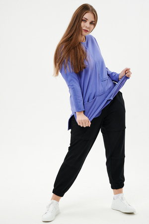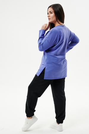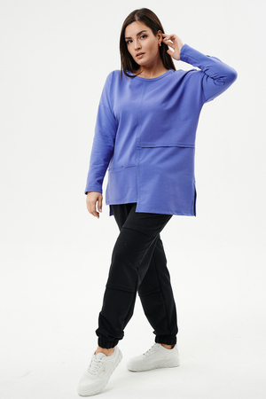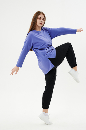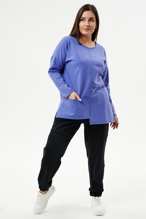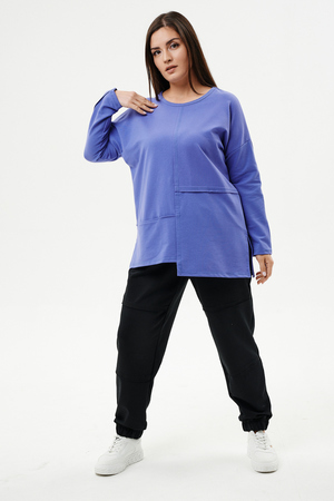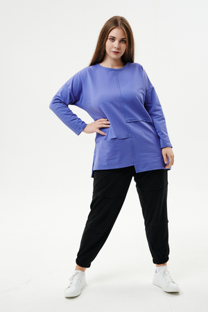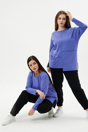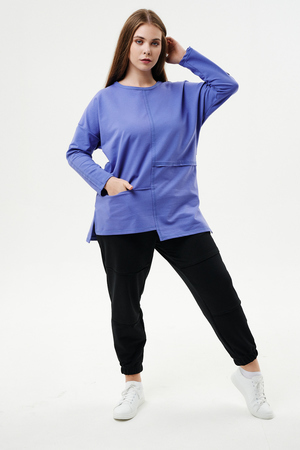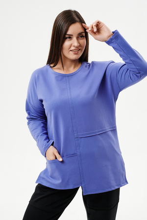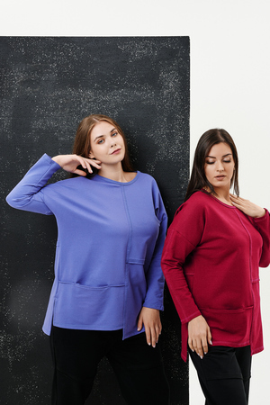 Туника прямого силуэта, горловина круглая, рукав длинный, цельнокроенный со швом, состоит из передней и задней частей. Полочка из четырех частей: на правой части внутренний горизонтальный карман в шве, на левой горизонтальный шов с открытыми срезами, аналогичный шов на спинке. В боковых швах разрезы.