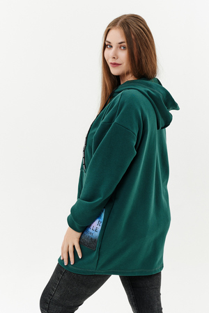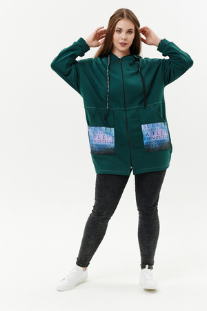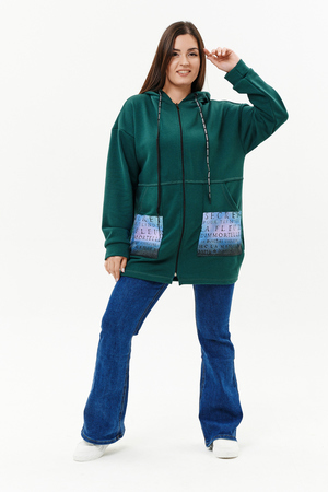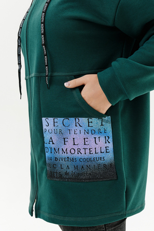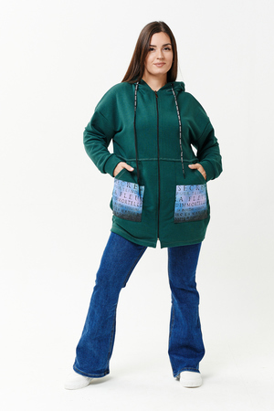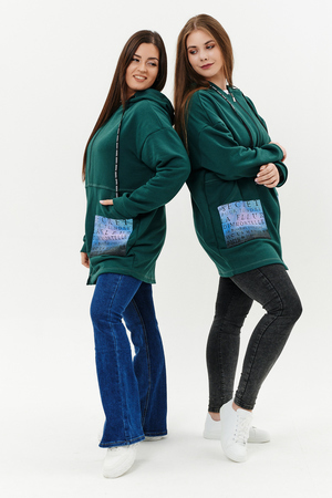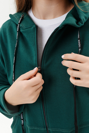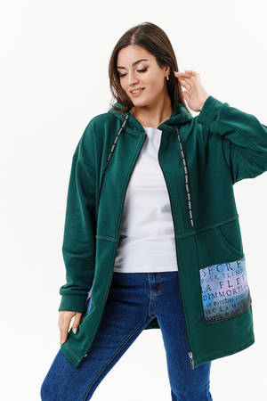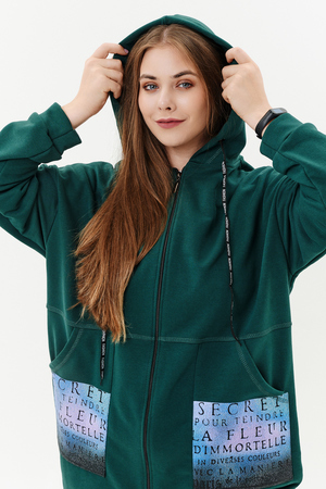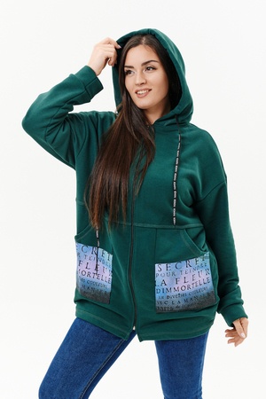 Толстовка женская прямого силуэта до линии бедер, в нижней части заужена по бокам. Рукав втачной с заниженной линией плеча, с манжетой. Капюшон с люверсами и декоративными шнурками с надписью. Застежка на тесьму-молнию. В нижней части полочки два накладных кармана со стильным принтом. Материал - футер 3-х нитка петля.