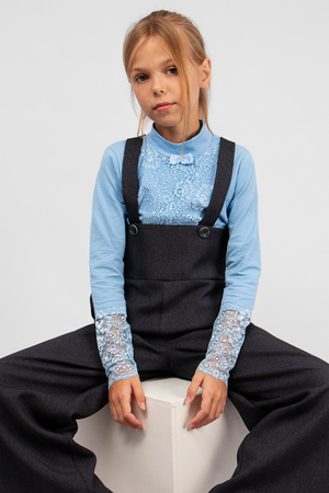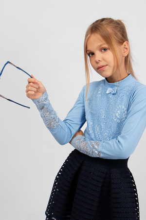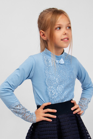 Изысканный гипюр на рукавах и передней части блузки образует цветочный узор. Горло - стойка. Мягкий, приятный к телу трикотаж обеспечит идеальную посадку изделия по фигуре. Гармонично вольется как в школьный, так и в праздничный гардероб.