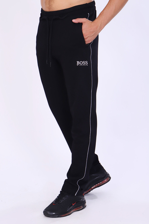 Брюки мужские изготовлены из качественного легкого трикотажа. Ткань приятна к телу и устойчива к истиранию. Современная практичная модель классических прямых брюк для удобства имеет пояс на резинке, дополненный шнуром с выходом на лицевую сторону в модной стилистике. По бокам расположен кант контрастного цвета. Спереди по бокам расположены вместительные прорезные карманы на молнии. На передней стороне слева под карманом находится буквенная вышивка контрастного цвета в тон канта. Сзади справа также расположен вместительный прорезной карман. Брюки - удобный вариант для неформального время препровождения, занятий спортом, отдыха на улице и дома, а представленная модель наилучшим образом подходит для этого.