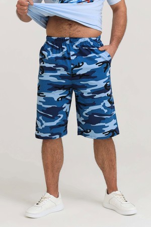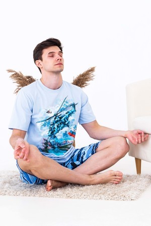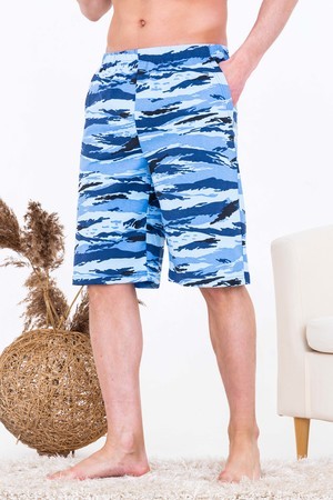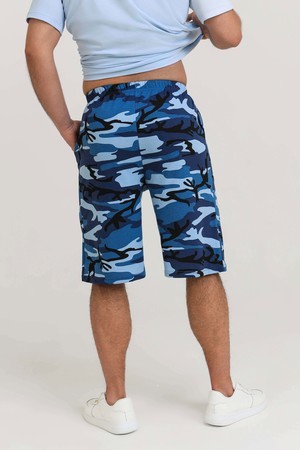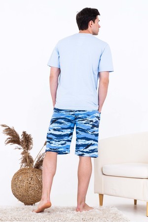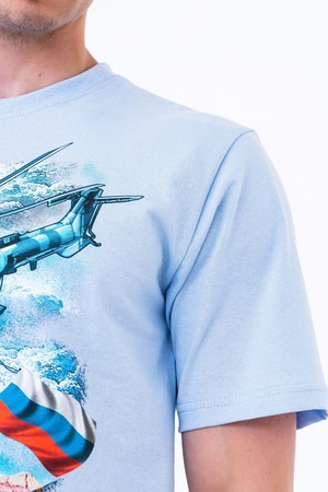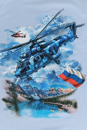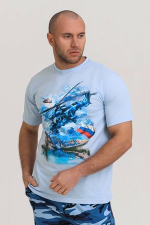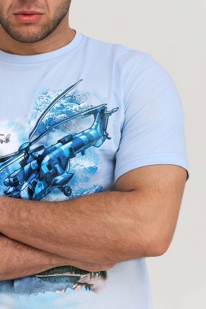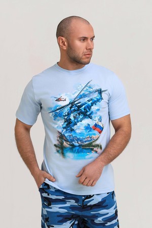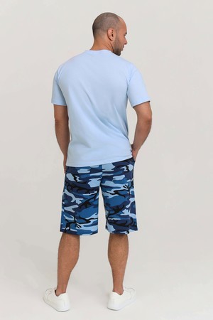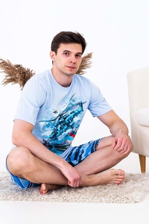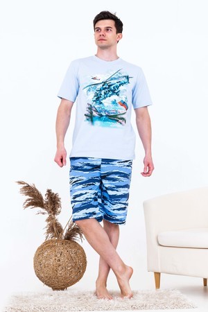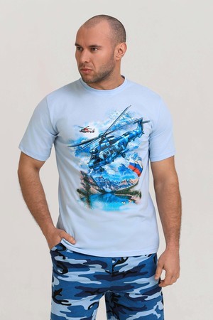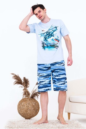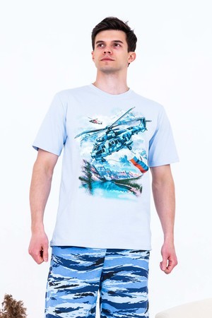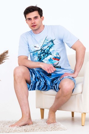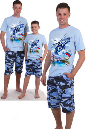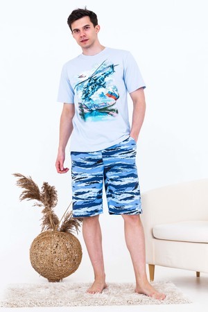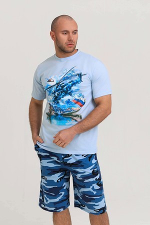 Мужской костюм из кулирки футболка + шорты. Светлая футболка с принтом в виде изображения вертолета. Шорты в дизайне «милитари», по бокам карманы, длина чуть ниже коленей. Рисунок камуфляжа может немного отличаться