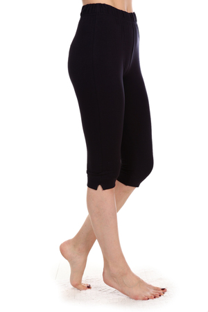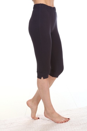 Темные бриджи женские из кулирки с лайкрой пенье. Облегающие, однотонные, пояс на резинке, внизу по бокам небольшие декоративные разрезы, общая длина чуть ниже коленей, несколько вариантов расцветки