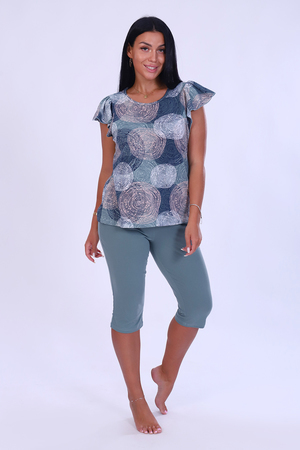 Домашний женский костюм изготовлен из кулирки - 100% хлопка. Женский костюм состоит из майки и брюк. Майка полуприлегающего силуэта с округлой горловиной. Бриджи прилегающие с карманами, притачным поясом, низ обработан на плоскошовной машине.