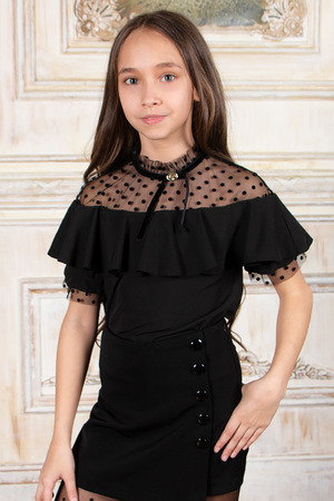 Верх выполнен из фатина в бархатистый горошек (флок). Грудь, спина и плечи обрамлены пышным воланом. Удобная застежка молния на спине. Прекрасный вариант для создания изысканного образа.