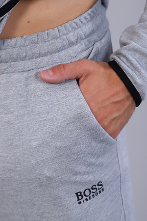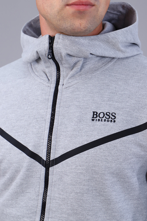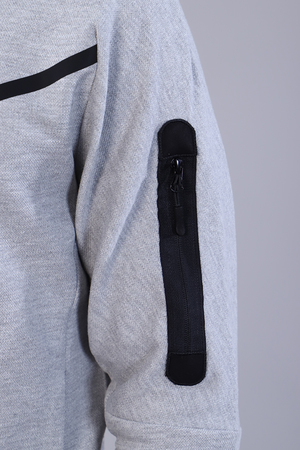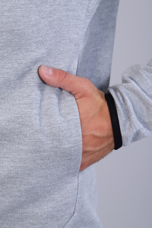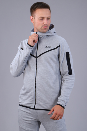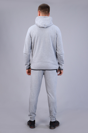 Стильный мужской костюм изготовлен из качественной ткани пике, представлен в двух расцветках. Толстовка на молнии, с двумя прорезными карманами без молнии. Воротник-стойка плавно переходит в капюшон. Слева на груди размещена текстовая вышивка, а также принт-печать в виде лаконичной полосы. Низ изделия и низ рукавов украшает кант контрастного цвета. Левый рукав толстовки имеет карман на молнии. Брюки прямого кроя на манжете, имеют боковые карманы без молнии; дополнены вышивкой, идентичной вышивке на толстовке. Пояс на резинке, дополнен шнуром для регулирования объема талии. Сзади брюки имеют вертикальный карман на молнии контрастного цвета, дополненной пуллером. Элегантный костюм идеально садится по фигуре.