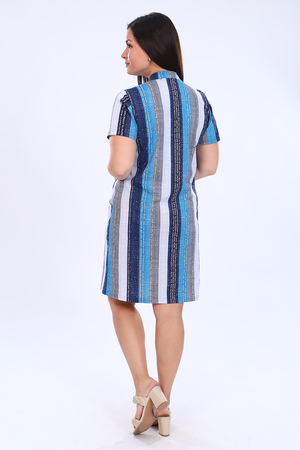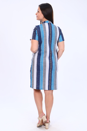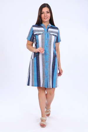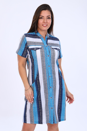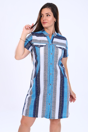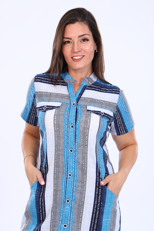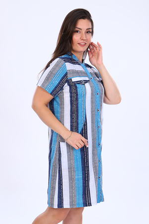 Халат выполнен в рубашечном стиле, с центральной застёжкой на пуговицах, воротник - стойка. Короткий втачной рукав.