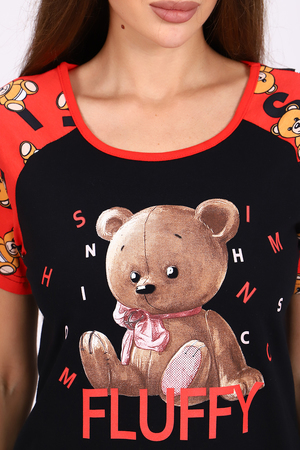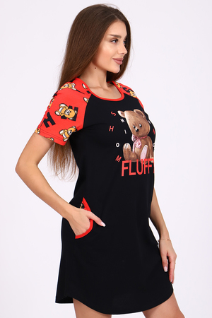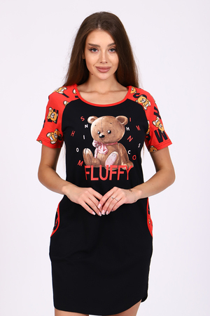 Женское платье-туника длиной чуть выше колена с милым принтом на полочке, короткими рукавами-реглан контрастного цвета и округлой горловиной. Низ платья закруглен и образует небольшие разрезы по бокам. Горловина и вход в карманы обработаны окантовкой красного цвета. Наличие боковых карманов добавит дополнительный комфорт при использовании. Выполнена из трикотажного полотна, 100% хлопок. Удобная, модная приятная к телу. Не стесняет движения. Яркие стойкие цвета соответствуют модным тенденциям. Можно носить как домашнюю тунику или уличное платье. Для дома и отдыха, для дачи. Отличный подарок девушкам по любому поводу!
