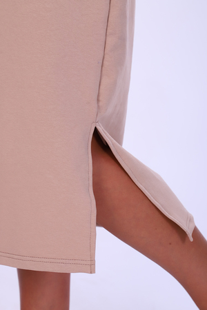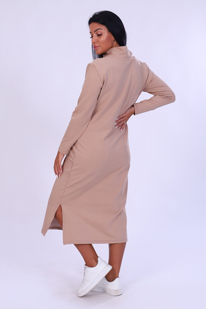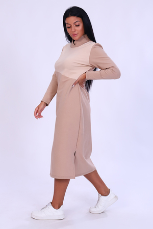 Платье женское из футера удлиненное прямого силуэта с длинным рукавом, полочка оформлена в двух цветах, воротник стойка на запах, в боковых швах по низу имеются разрезы. Замечательный вариант в прохладную погоду.