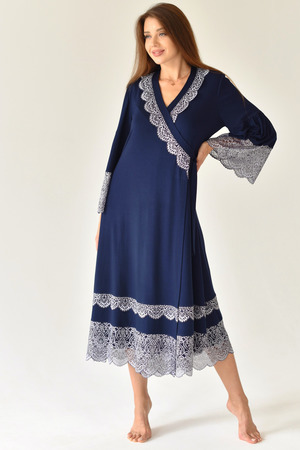 Комплект состоит из сорочки, халата и пояса. Комплект из вискозы с кружевом в цвет. С длинным рукавом