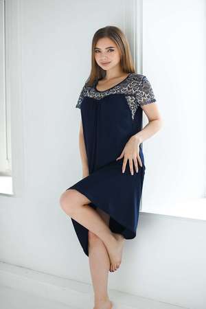 Сорочка трапецевидного силуэта, длиной за колено, с кружевным рукавом. По переду и горловине сорочка декорирована эластичным кружевом. В области груди расположена эффектная сборка.