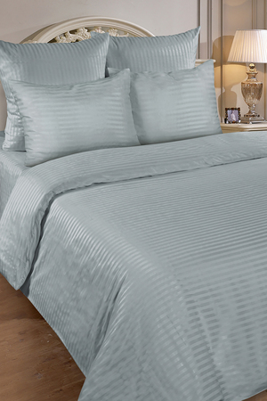 Материал очень красивый, элитарный, глянцевые полосы здесь чередуются с матовыми, при этом изнаночная и лицевая стороны выглядят одинаково. Состав ткани страйп-сатина для постельного белья полностью натуральный – здесь присутствует только хлопковая нить высокого качества. Для пошива постельных принадлежностей используется полотно с плотностью расположения нитей 120-150 г/м², что обеспечивает хорошую мягкость и прочность белья. По завершению плетения выполняется мерсеризация полотна – обработка раствором каустической соды. Такая процедура увеличивает блеск поверхности, плотность и прочность ткани, служит защитой от выгорания.