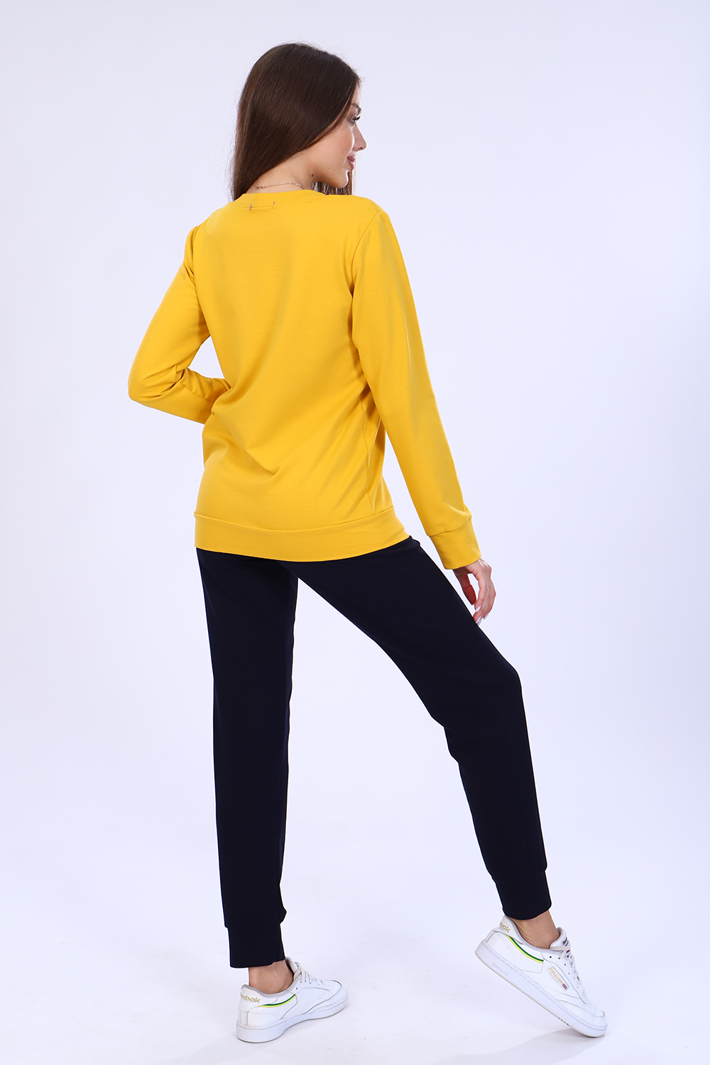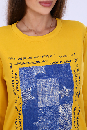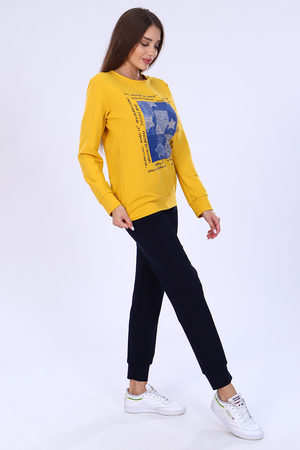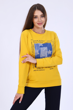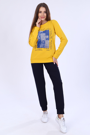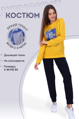 Костюм женский из футера 2-х нитки состоит из кофты и брюк. Кофта - прямой силуэт, горловина круглая, рукав длинный, втачной, низ рукава на манжете, низ кофты на поясе, на полочке принт. Брюки прямого кроя, верх на поясе на широкой резинке, в боковых швах внутренние карманы, низ брюк на манжете. Такой комплект отлично подойдет для дома и отдыха.