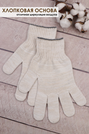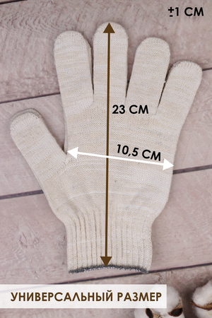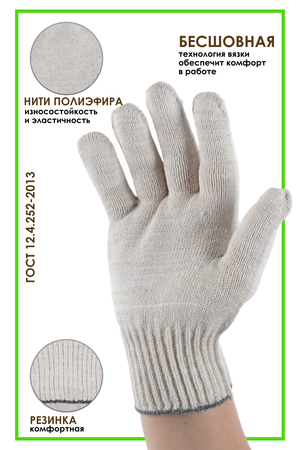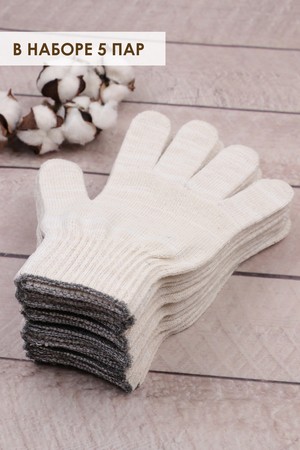 Перчатки трикотажные вязаные из х/б смесовой пряжи с добавлением полиэфирной нити. Выполнены из 90% хлопка и 10% полиэфира, класс 10, шести нитка, цвет: белый, в упаковке: 5 пар.
