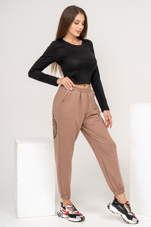 Брюки женские свободного силуэта. С поясом на резинке. Брюки с карманами в боковых швах. По низу брюки собраны на резинку. На задней части брюк расположена печать.
