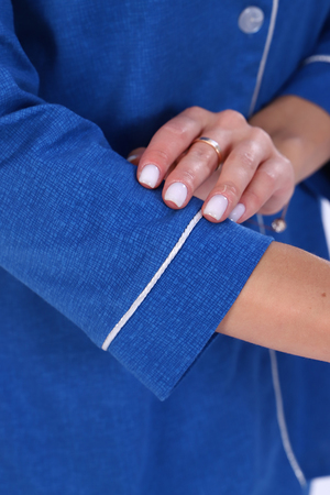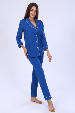 Женский домашний костюм-пижама, состоящий из жакета-рубашки и брюк. Сшит из трикотажного полотна, 100% хлопок. Рубашка с укороченным рукавом 7/8, полуприлегающего силуэта на пуговицах, с воротником в английском стиле, с нагрудным карманом. Манжеты рукавов и брюк отделаны серебристым кантом. Брюки классические, на широкой резинке на талии (параметры талии брюк указаны при собранной резинке). Удобный, модный комплект приятен к телу, не стесняет движения. Можно носить, как медицинскую униформу или спецодежду. Домашний костюм - незаменимый предмет гардероба каждой женщины. Можно носить, как пижаму. Для дома, отдыха и сна, на дачу. Прекрасный подарок милым дамам по любому поводу!