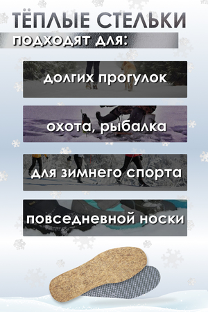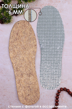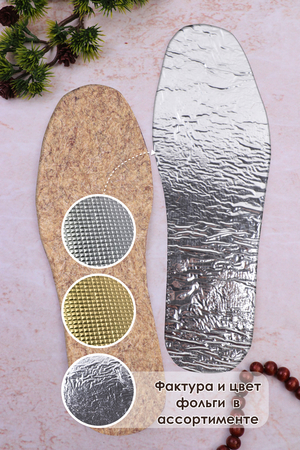 Шерстяные стельки с фольгированным покрытием выполнены из 100% шерсти, материал войлок. Отличаются удобной толщиной 6 мм., и эффективным сохранением тепла. Двухслойная зимняя стелька устойчива к морозам, обладает уникальными теплозащитными свойствами. В комплекте одна пара, выбранного Вами размера. Фактура и цвет фольги в ассортименте