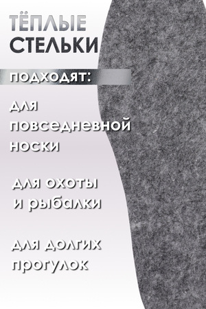 Стельки GL46 выполнены из 100% шерсть, материал: войлок. Тёплые стельки из войлока - это отличное решение для утепления в осенний и зимний период. Зимние стельки обладают теплоизолирующим эффектом, оставляя ваши ноги всегда в сухости, тепле и комфорте. Подходят для долгих прогулок, охоты, рыбалки, путешествий, спорта и для повседневной носки. Толщина 4-5 мм. Оттенки серого могут незначительно отличаться от представленных на фото.