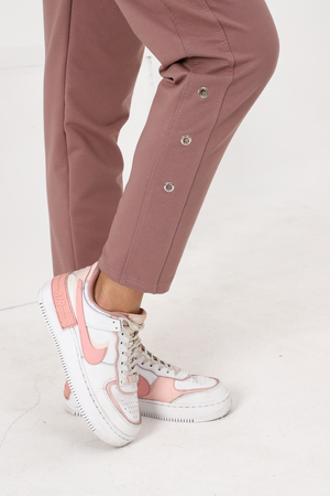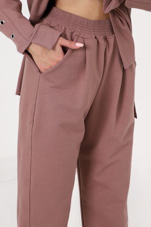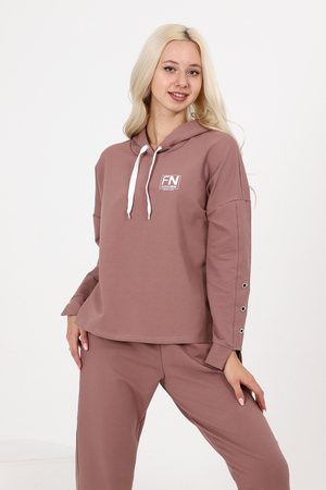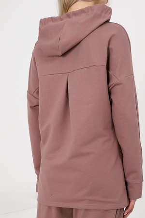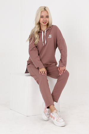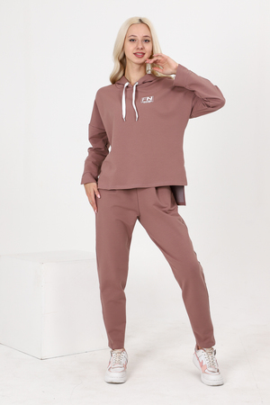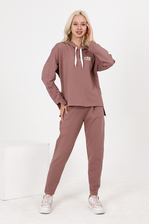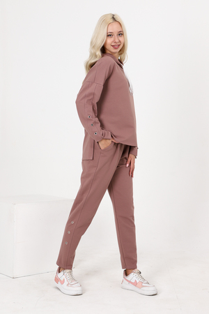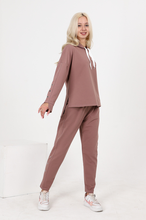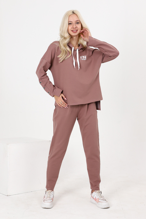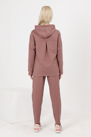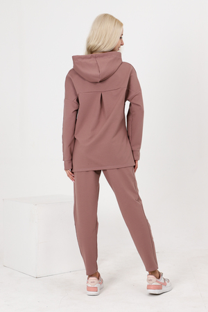 Костюм состоит из толстовки и брюк. Брюки свободные, на поясе, с боковыми карманами. В верхней части передних половинок, по шву притачивания пояса, расположены складки. Вдоль боковых швов расположены лампасы с декоративными люверсами в нижней части. Толстовка прямая, свободная, с удлиненной спинкой, с капюшоном. Рукав длинный, на фигурном манжете, с продольным лампасом и декоративными люверсами. Спинка с кокеткой. В нижней части боковых швов обработаны разрезы.