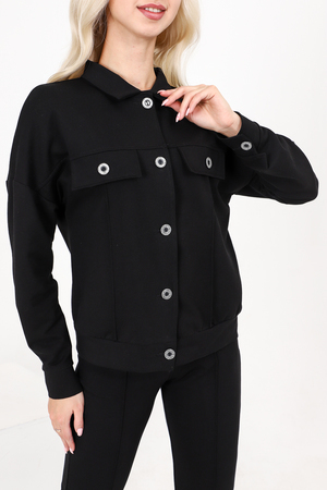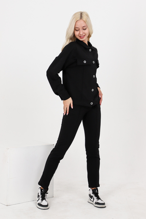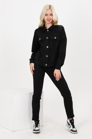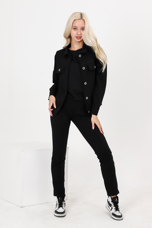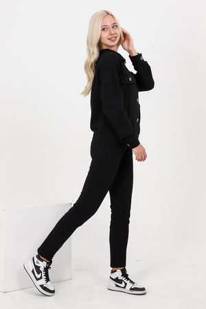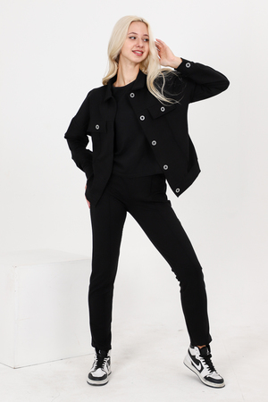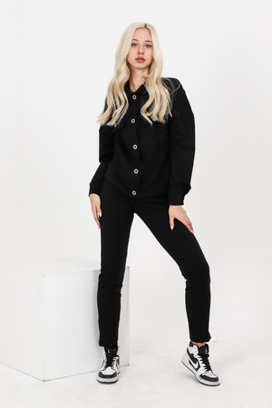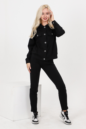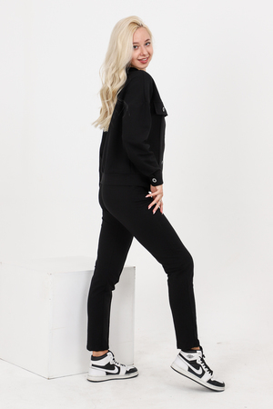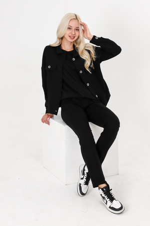 Костюм состоит из бомбера и брюк. Бомбер с застежкой на пуговицы и петли, с отложным воротником, свободная, на поясе. Полочка и спинка с кокетками. Рукав длинный, на манжете с застежкой на петлю и пуговицу. Брюки на поясе, с боковыми карманами. Вдоль передних половинок обработаны "стрелки".